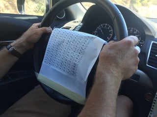 Each team gets two cars, and there’s actually an order to what looks like total insanity on T.V. The cars line up based on the position of their highest guy in the overall standings, so the team with the yellow jersey gets first place in the caravan. All of the teams’ Car 1s line up first, then their Car 2s. Each car has a sticker on the back windshield with its number so they can’t cheat. Car 1 numbers are black and white. Car 2 numbers are red. Wohlberg taped a piece of paper over the steering wheel with every racer in the Tour’s name and bib number on it, and stuck another two pieces of paper to the dashboard showing this stage’s elevation profile and a map. He papered up the Acura because he hates trees.