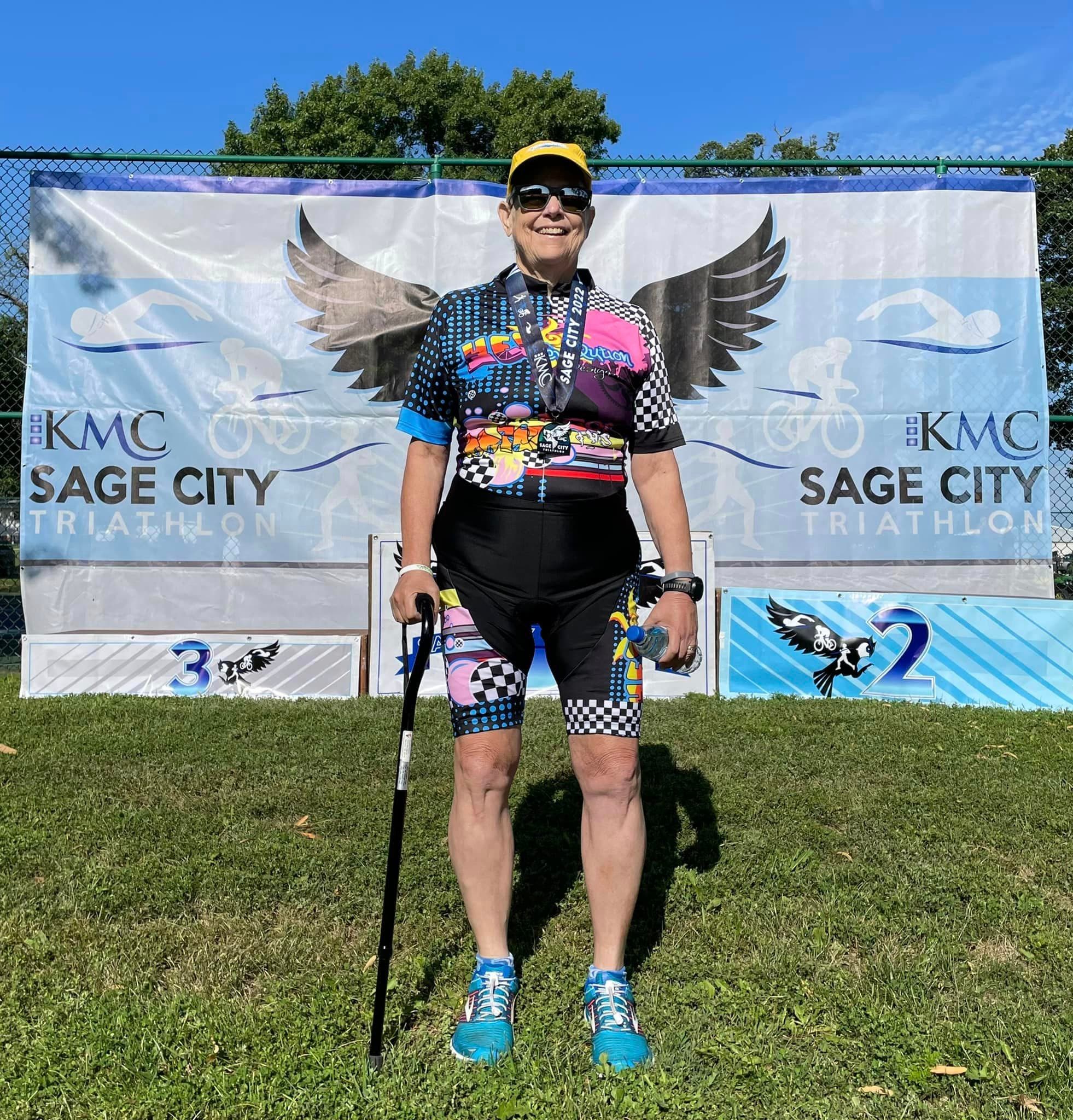 In August, Suellen completed a mini-sprint tri race in Illinois – a 100 meter pool swim, five mile bike, and one mile run. It may have only been 6.06 miles, but the accomplishment was as grand as finishing 140.6 miles.