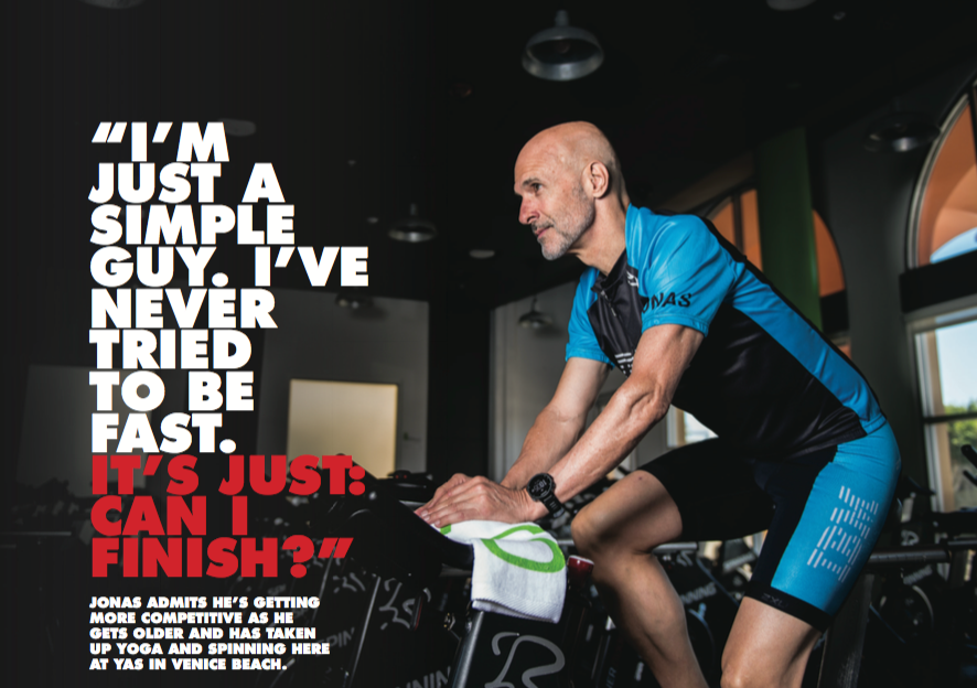 Race morning, “I look at Scott Tinley,” Jonas says, “and go, ‘Are you telling the truth? There are people that can swim freestyle all the way across there?’ And he looks at me like, ‘Why are you here?’” Amazingly, Jonas finished. “I was second to last. I was so dehydrated, I was ill for four days.” Despite all that, he started racing tris here and there—mostly shorter distances and at lower altitude.