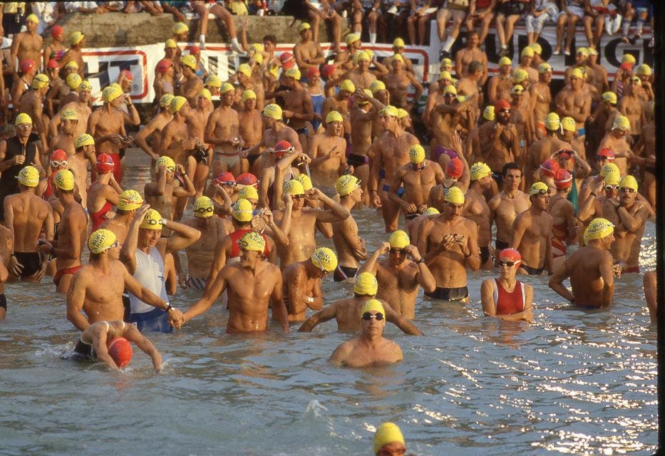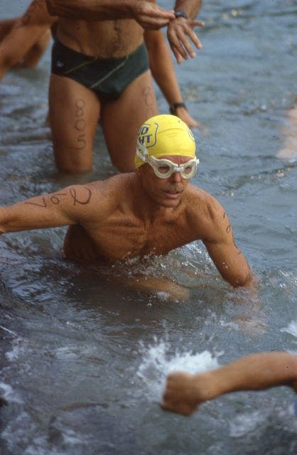 Wetsuits have never been permitted in the race, and swim skins wouldn’t be invented for another 20 years.