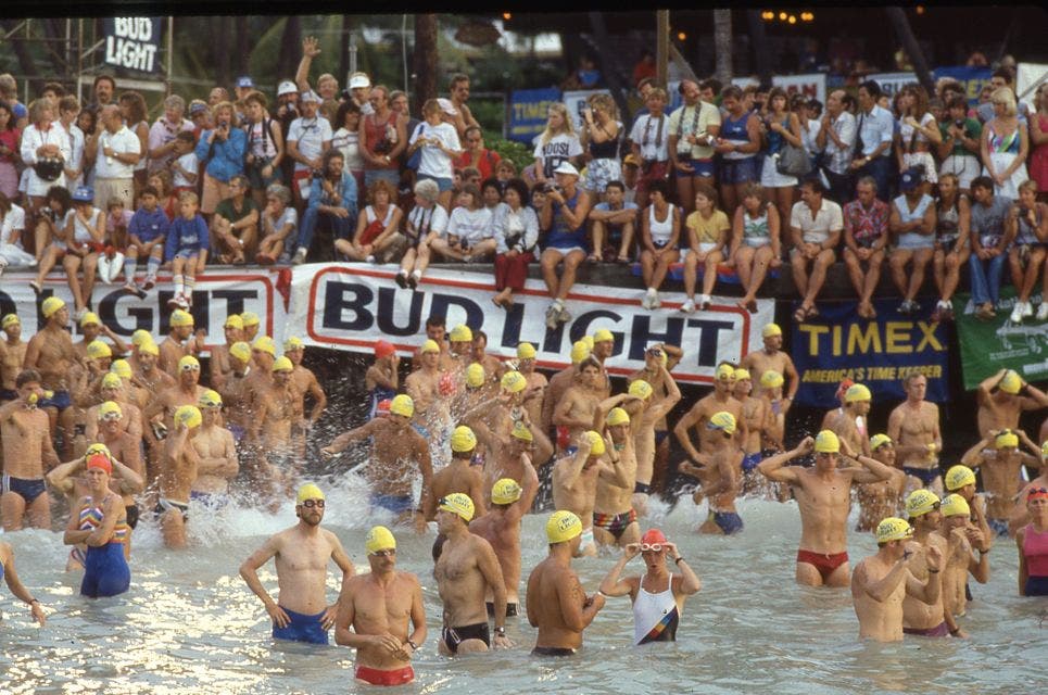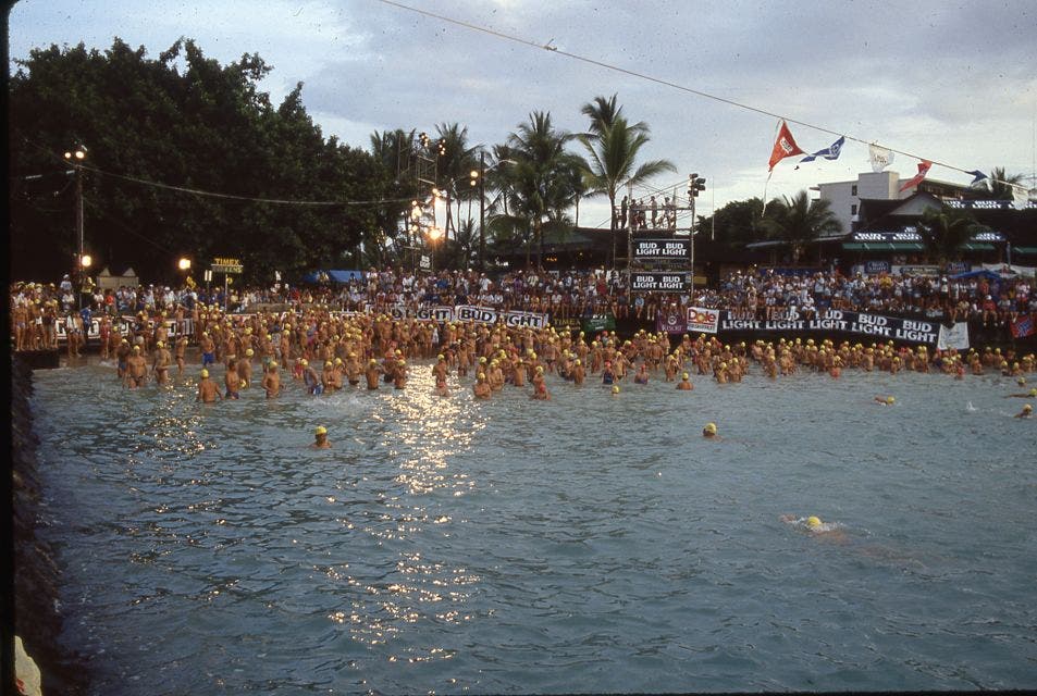 TRIATHLETE.COM IS ARCHIVING THE HISTORY OF IRONMAN HAWAII WITH GALLERIES OF THE PAST 28 YEARS OF KONA. CHECK BACK ON THURSDAY FOR IMAGES FROM 1986. Athletes lining up for the 1985 Ironman world championship in Kailua Bay in Kona, the same location as the race start today.