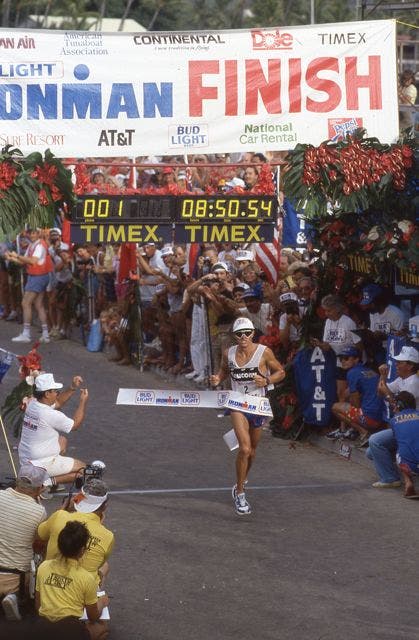 Tinely won the race and broke Scott’s course record, finishing in 8:50:54, more than 25 minutes ahead of Hinshaw in second. It was his second and final Ironman world title.