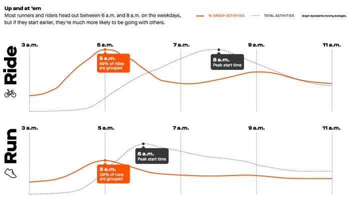 The majority of group rides and runs (yes, Strava has figured out when you’re riding in a group) start at 5 a.m. local time. The majority of individual rides begin at 8 a.m., while runners like to get up earlier and start at 6 a.m.