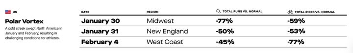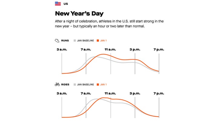 Strava has also presented info on what makes us not want to train. Both runners and cyclists will start an hour or two later on Jan. 1 than normal (about the amount of time it takes to defog that head, approximately), and this year’s “polar vortex” in North America in January and February made people stay inside roughly between 45-77 percent more for running and 53-77 percent more for cycling.