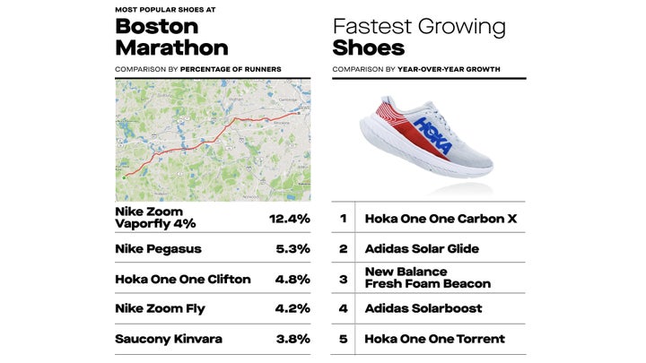 Strava collects info on user-inputted gear, and has found that Hoka’s new Carbon X is one of the fastest growing pairs of user-submitted running shoes, while (as we pretty much knew) Nike’s Zoom Vaporfly 4% was the most popular shoe inputted by Strava users at the 2019 Boston Marathon.