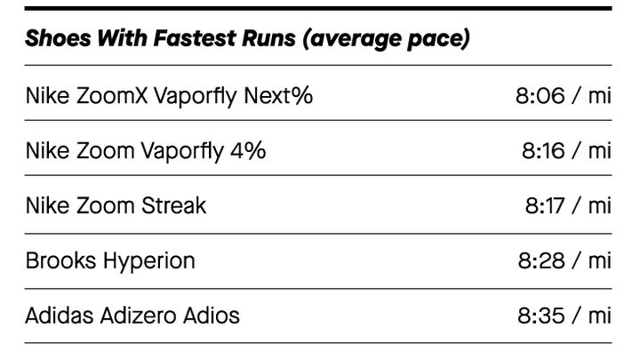 It’s no surprise that the rise in carbon-soled shoes from Nike produced the top two fastest types of shoes, with the Nike ZoomX Vaporfly Next% and the Zoom Vaporfly 4% taking the two top speedy spots, respectively.