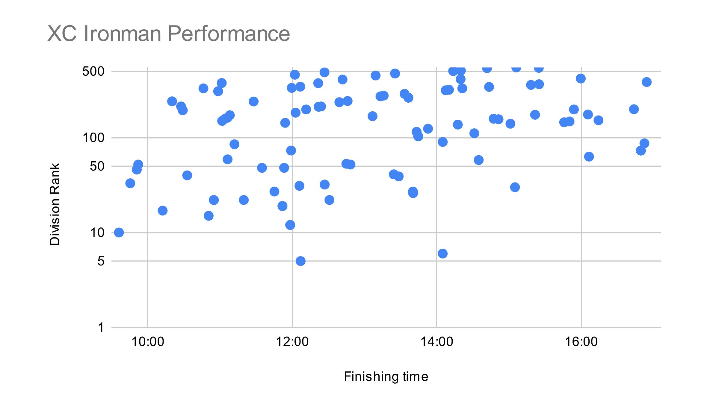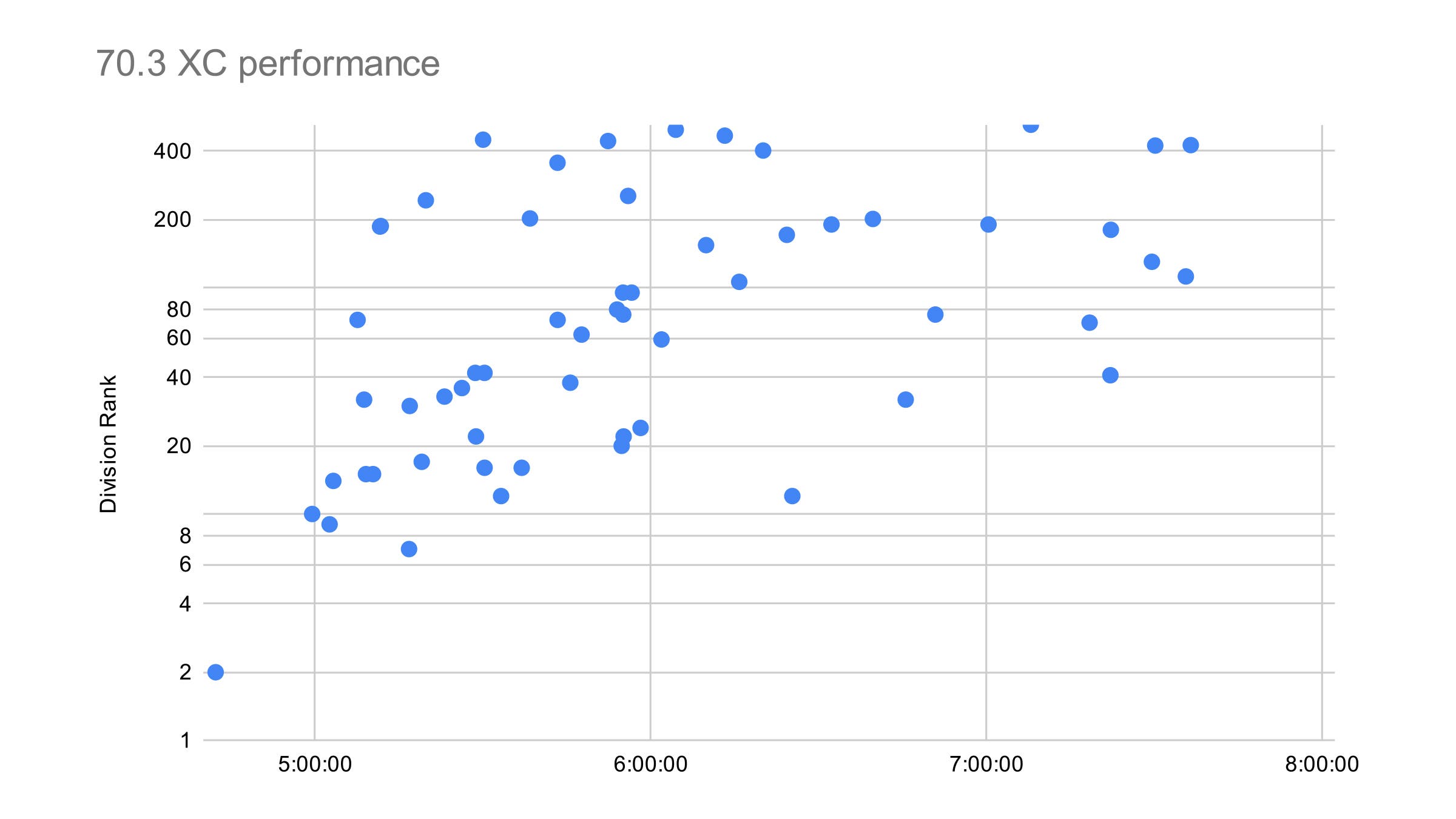 Starting with the 70.3 races, the graph below plots XC triathletes’ finishing time versus their division (age group) rank.