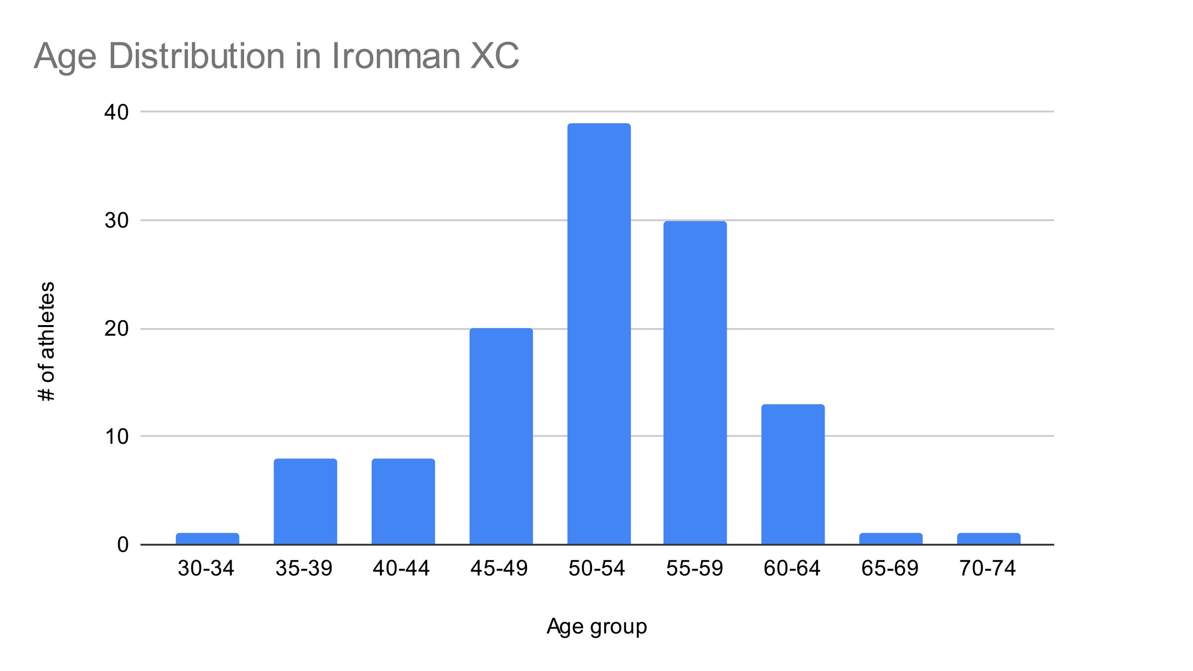 In terms of profile, we can see from the age distribution below that these triathletes are slightly older than the norm. For regular triathletes, the largest group tends to be the 45-49 group closely, followed by the 40-44 and 50-54 age group. With XC it shifts one age group to the right.