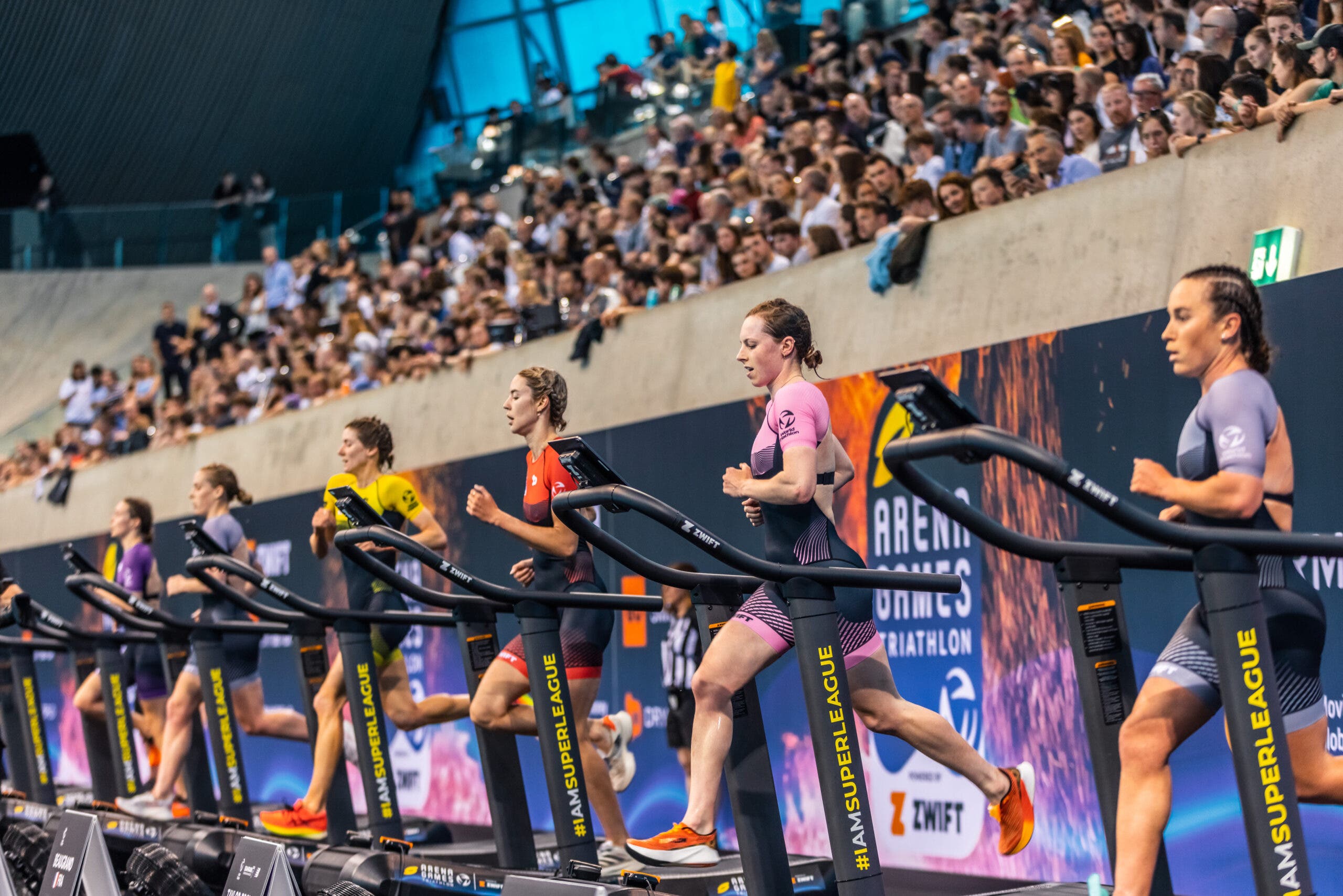 The components are a 200m swim, 4km cycle, and 1km run. That’s the easy bit. But given the concept is swim-bike-run, then run-bike-swim, then swim-bike-run, with a time-trial final stage based on time deficits, it’s not uncomplicated for the uninitiated. Thankfully, the duo are ably supported by the big screens—something the Arena Games is again getting very right. Unlike the outdoor version of Super League, the Arena Games are conducted entirely inside these massive arenas—with the athletes swimming in an Olympic-size pool before jumping on those Zwift-connected treadmills and bike trainers.