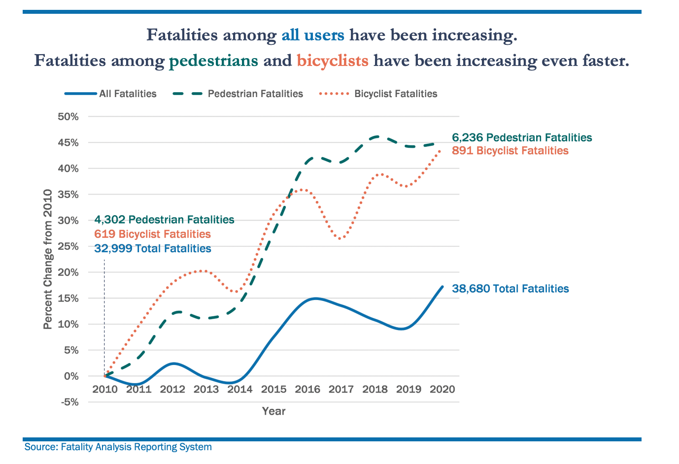 For decades the widely held view has been that crashes were due to human error, and people on bikes simply had to accept the risk of being a vulnerable road user in a time when vehicles have become larger and drivers more distracted than ever. As a result, the number of road fatalities has increased every year. More than 38,000 road users died in 2020, an increase of about 2,500 from 2019; preliminary data suggests the 2021 count is even higher.