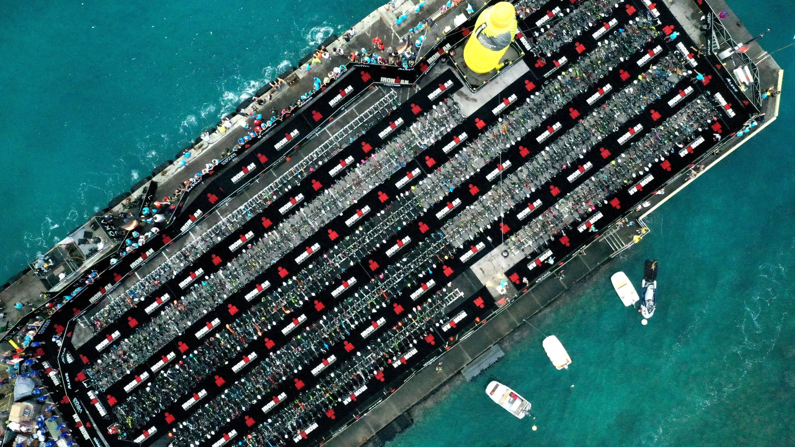 The central hub of the race is the Kona pier, a concrete platform that juts out into the ocean. The location serves as the swim start, transition area, and finish line. On an average day, the pier looks like a big piece of real estate, with multiple boats docking and plenty of people lined up for day tours to see dolphins or go snorkeling at the Captain Cook reefs. But on race day, the pier suddenly looks tiny, with row after row of triathlon bikes cramped together and a mass of humanity flowing from swim to bike to run.