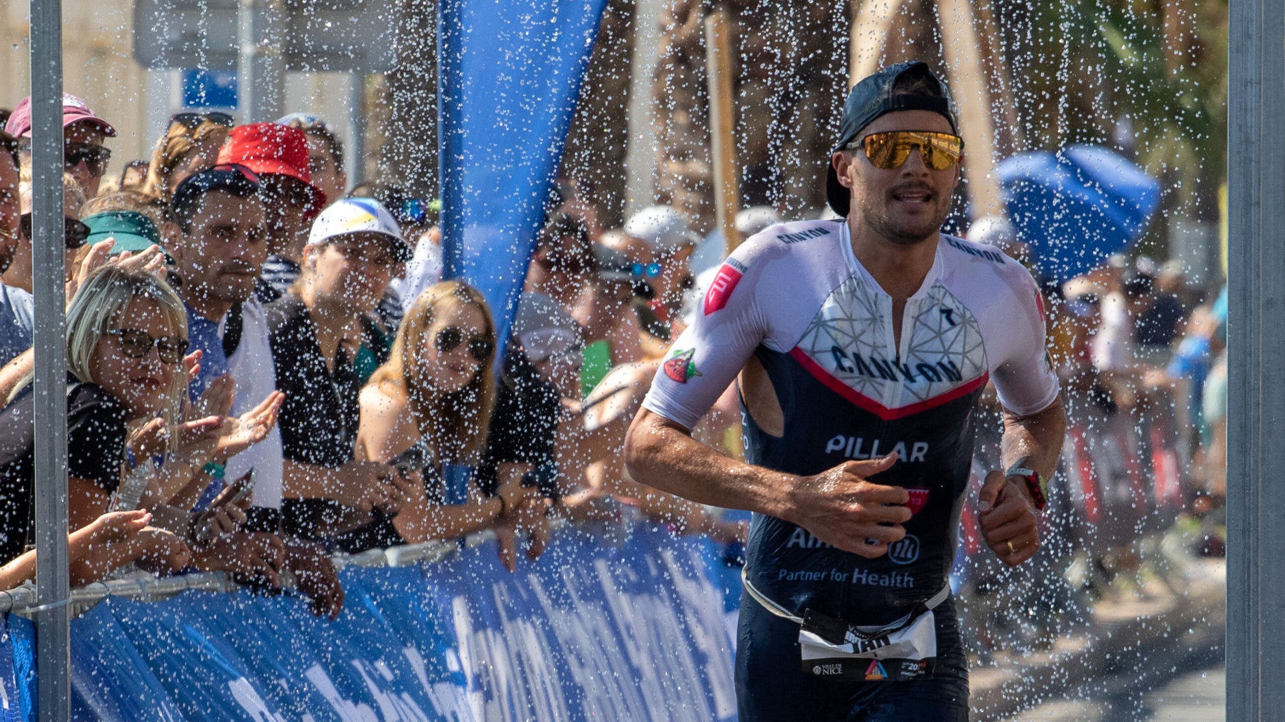 Sam Laidlow celebrates winning the men's 2023 Ironman World Championship in Nice, France. (Photo: Brad Kaminski/Triathlete)