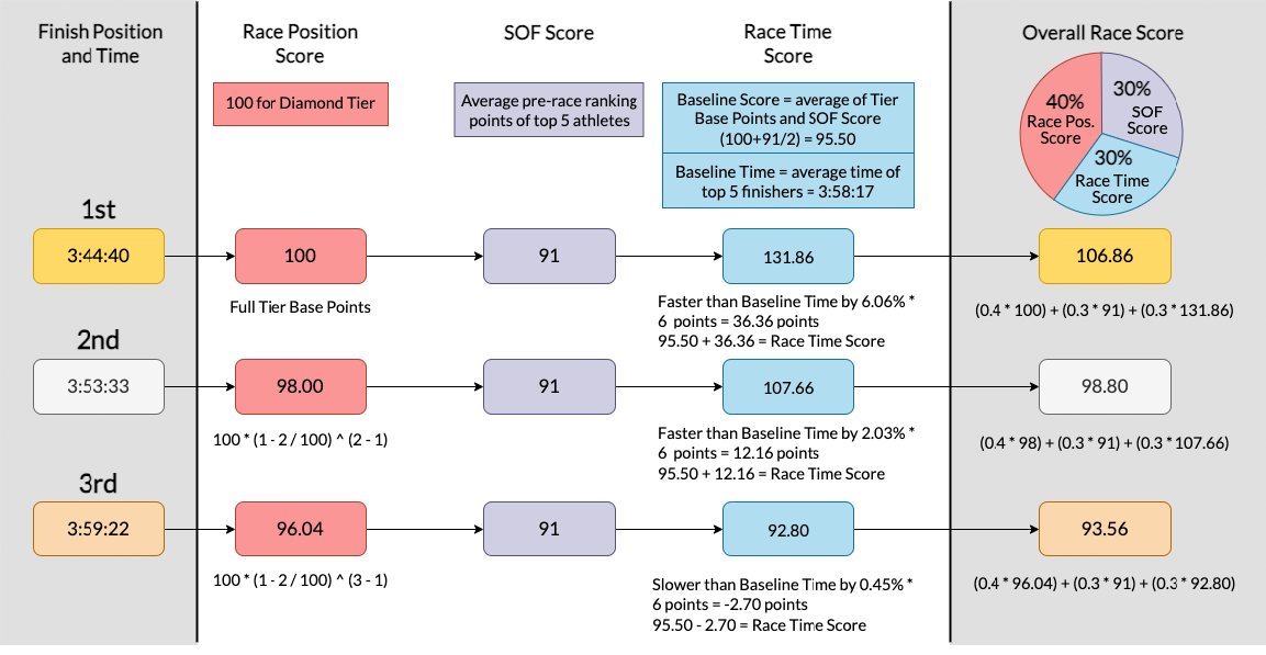 The overall race score is calculated as 40% of an athlete’s Race Position Score, 30% of the SOF Score and 30% of an athlete’s Race Time Score. The graphic, below, is probably the best way to illustrate.