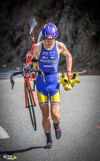“The wheel was completely blocked, so I couldn’t even push it,” Laidlow says. “So I had to run up the last col (about 6 kilometers), and then I realized I had to find a way to get the wheel to turn if I wanted to finish it. So after having kind of fixed that, I freewheeled down for 10 kilometers and then pushed the bike for a further 11 kilometers to T2.”
