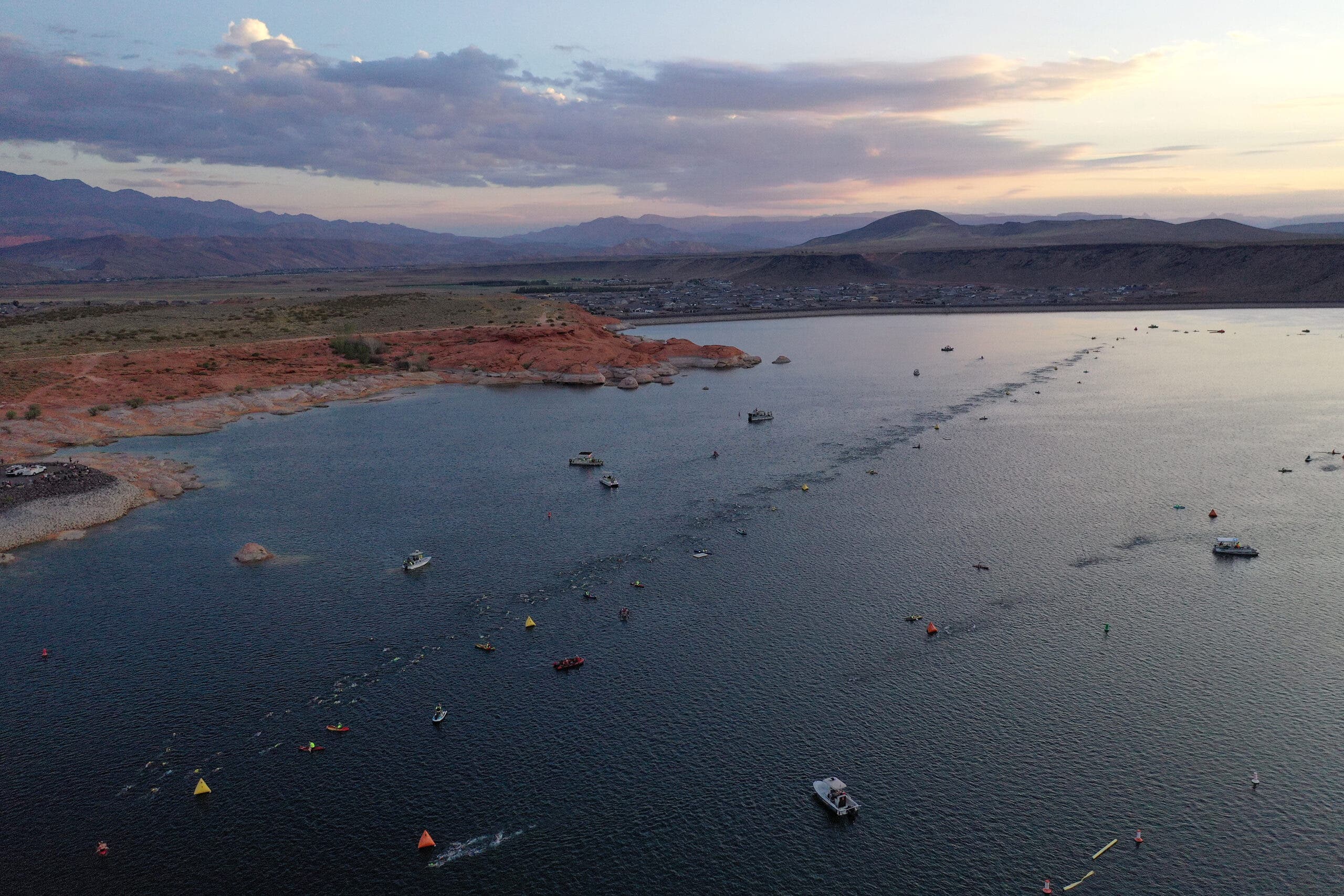 Sand Hollow doesn’t have the palm trees and dolphins of Kona’s Dig Me Beach, site of the Ironman World Championship in Hawaii, but it’s a stunning swim venue nonetheless. The reservoir, filled with crisp, clear water, is surrounded by miles of red mountains, which disintegrate into rust-colored sand as it slopes into the shores of Sand Hollow. Approximately 300 meters from the boat ramp where the swim begins and ends, there is a line of tiny red islands that poke through the surface of the water. In the summertime, they are covered with children and teenagers who swim out to the rocks to do backflips and cannonballs; in the spring, wetsuit-clad triathletes are known to do the same.