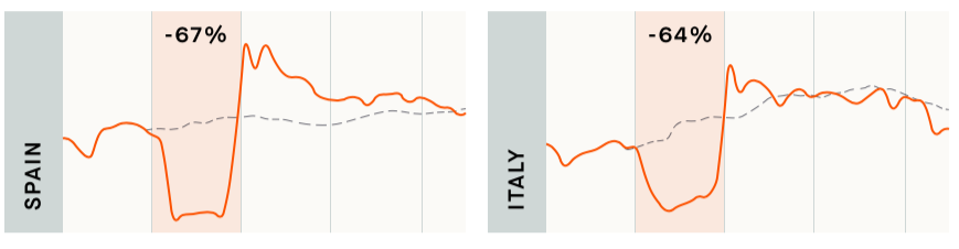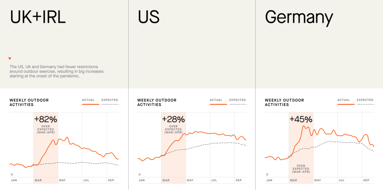 While overall activity was up, that came largely from countries where exercising outside was still allowed without restrictions. The story is different for places like Spain and Italy, where strict lockdowns in March and April kept more people indoors completely. The drop in weekly outdoor activities was initially steep—down to almost nothing—and then peaked in May when the restrictions were eased.