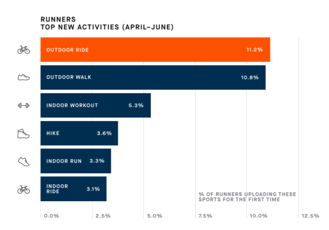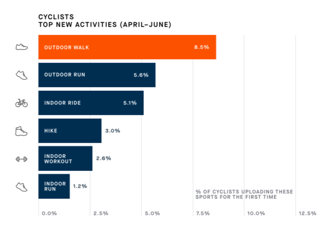 In stats from April to June, 11.2% of runners uploaded an outdoor ride for the first time. On the other end, 5.6% of cyclists uploaded an outdoor run for the first time. Both runners (8.5%) and cyclists (11.2%) enjoyed more leisurely activities by uploading an outdoor walk for the first time.