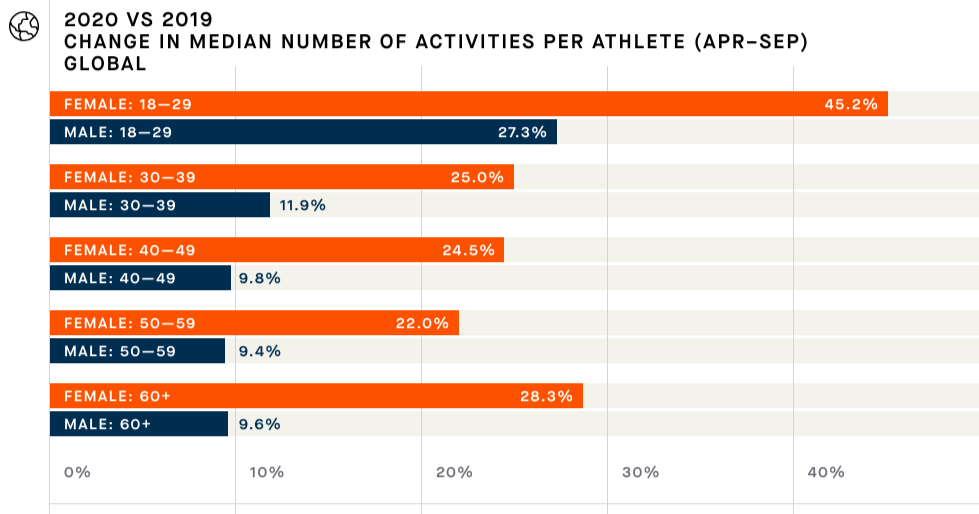 In the United States and globally, the growth in activities uploaded to Strava was most dramatic with women and younger athletes. Does this mean more women and younger athletes are getting outside or they’re just beginning to get into Strava? We can’t tell from this data, but it’s interesting nonetheless.