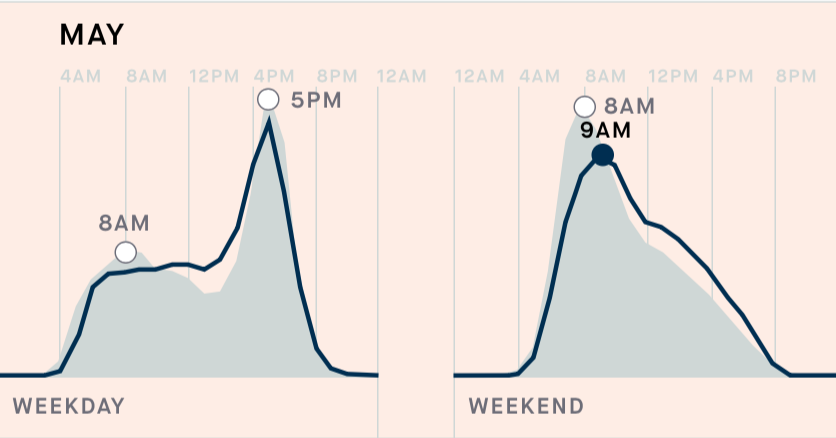 Though the start time of activities has shifted closer to where it was in 2019 (likely partly due to the restriction of daylight), May showed a significant change from the prior year. Runs and rides tended to start a little later in the morning or earlier in the afternoon in 2020, while weekend activities starting before 9 a.m. fell off substantially. Is WFH making people sleep in?