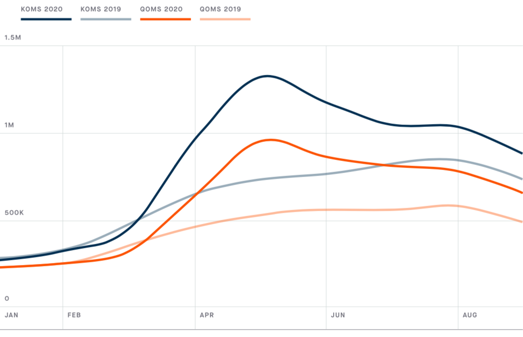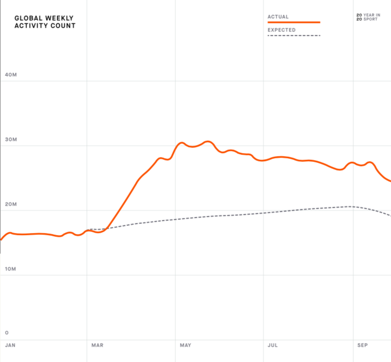 If the order to work from home, parent from home, school from home (i.e., do life from home) made you want to get outside and move (from a safe distance from others), you’re not alone. Strava shared a graph showing its projected global weekly activity based on past trends versus the actual count—the result? A sharp increase in the second week of March through September, when both actual and expected declined, due to chilly temps in the Northern Hemisphere.