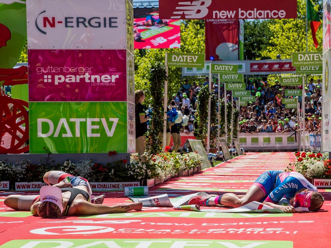 At the 2018 edition of Challenge Roth on July 1, Lucy Charles (GBR) and Daniela Sämmler (GER) battled all the way to the finish line. Charles, one of the best swimmers in the sport, led the swim and bike before being caught by Sämmler with 5K left to go on the marathon. After fading to 40 seconds back at one point, Charles gave it one more all-out effort to get within 10 seconds as the two women charged into the stadium for the finish. Sämmler had just enough to hang on for the biggest win of her career, breaking the tape just nine seconds ahead of Charles. The finish line photos are pretty epic.