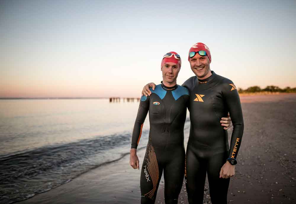 Solarz, 38, and Calimano, 36, met doing Ultraman Florida in 2016, and clearly, they’re no strangers to long, hard events: Solarz, an NYC-based pension fund consultant, did the signature Epic5 Hawaii in 2014 and also holds Guinness records including the greatest distance run in 12 hours on a treadmill (that’s 77.07 miles); Staten Island-based Calimano, an IT manager, has races like 4 Deserts (7 days, 250K, including the Sahara and Gobi deserts) under his belt. The key to ultraracing, they say is to “preserve yourself for the next leg and the next day,” as Solarz puts it. “I mean, if you saw what we were doing on the bike, it was not impressive—the whole thing is really low impact.
