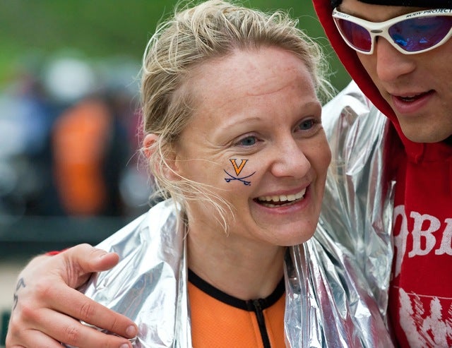 Kelleher: We train together as much as we can with our schedules. He is a great cyclist and really pushes me on the bike. He is very supportive. There is no way I could pursue triathlons without his support. I don’t have a lot of material resources to help me become a better triathlete. I ride an ancient bike that I got cheap off Ebay. I have very old used race wheels that are literally falling apart and I just got my first real wetsuit before this race. But, I have abundant human resources surrounding me. I have a great husband and great triathlete friends here in Charlottesville that really love me and genuinely want me to succeed. Leading up to this race I had friends who stepped up to help me with all my major workouts, even if that meant forfeiting their own workouts.