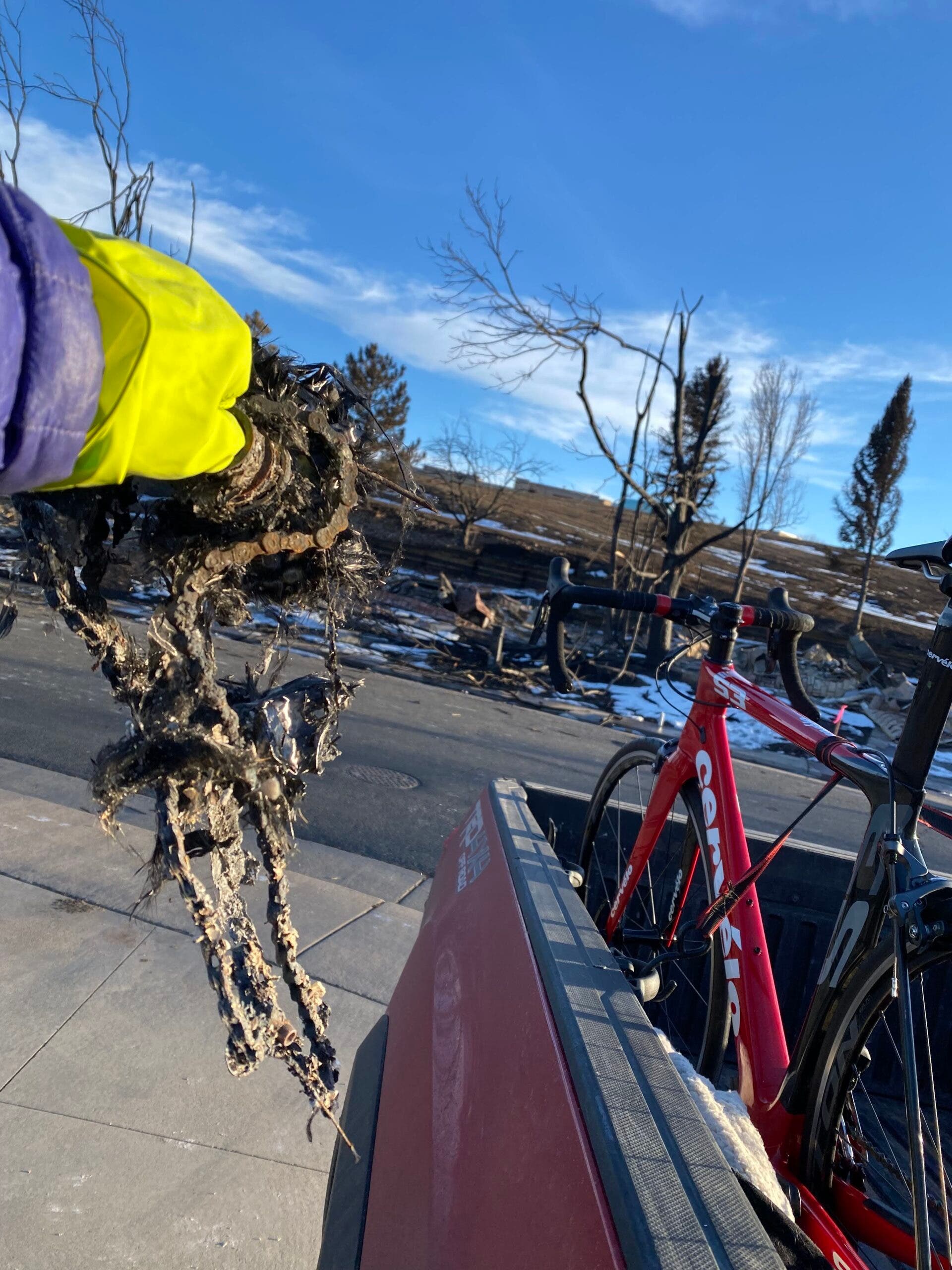 On a recent trip to sift through the ashes of their house, Thompson was able to find what was left of Justin. The once red and white carbon fiber bike is now nothing but blackened remains, with only a bit of the cassette and chain discernible.