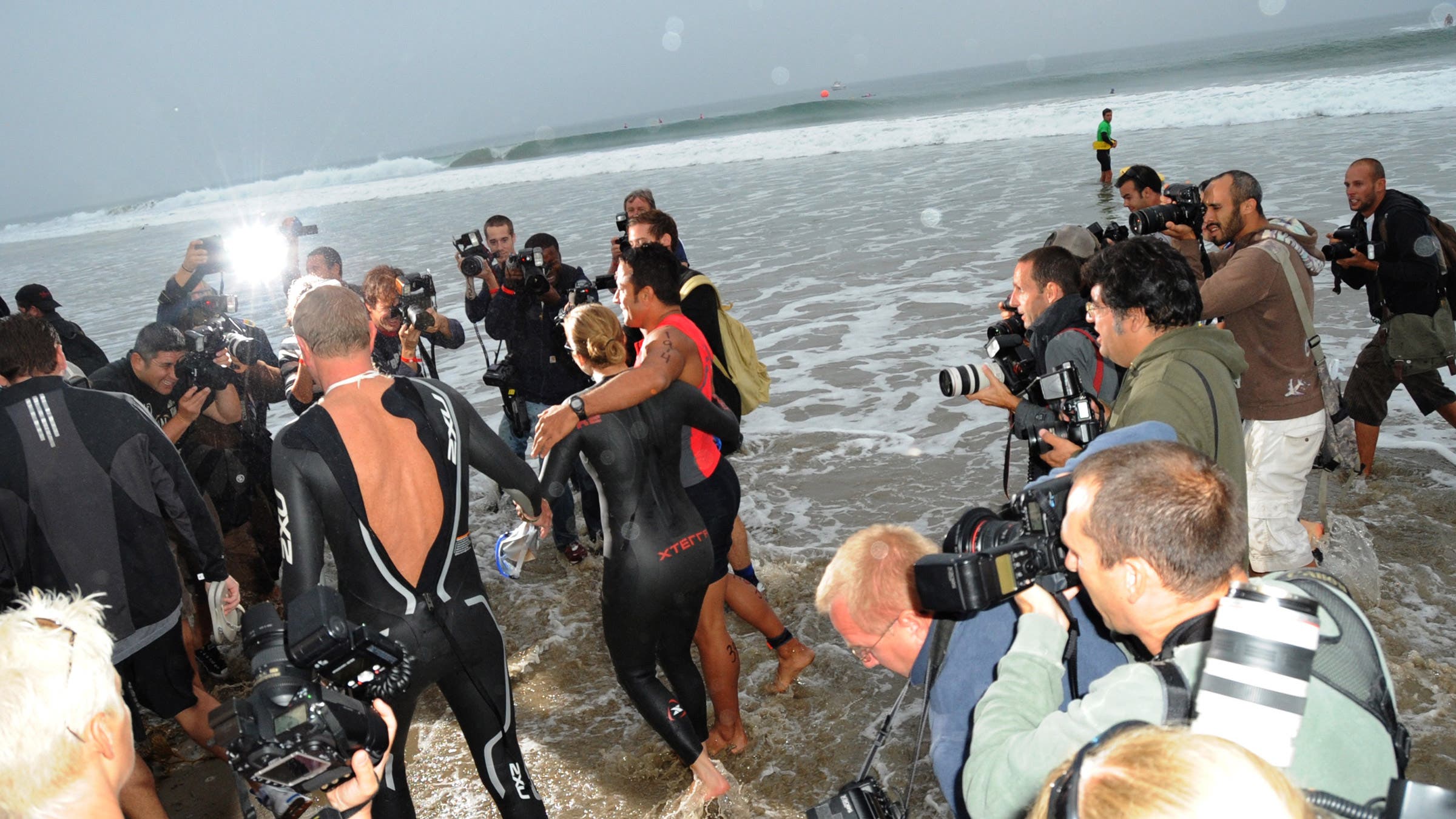 When Lopez joined the wetsuit-clad mass gathered on the beach for final race instructions, she blended in while nervously fidgeted with her goggles and wetsuit. There’d be no VIP area in the angry, 64-degree Pacific ocean. Once the gun went off, Lopez was just another swimmer in the crowd.