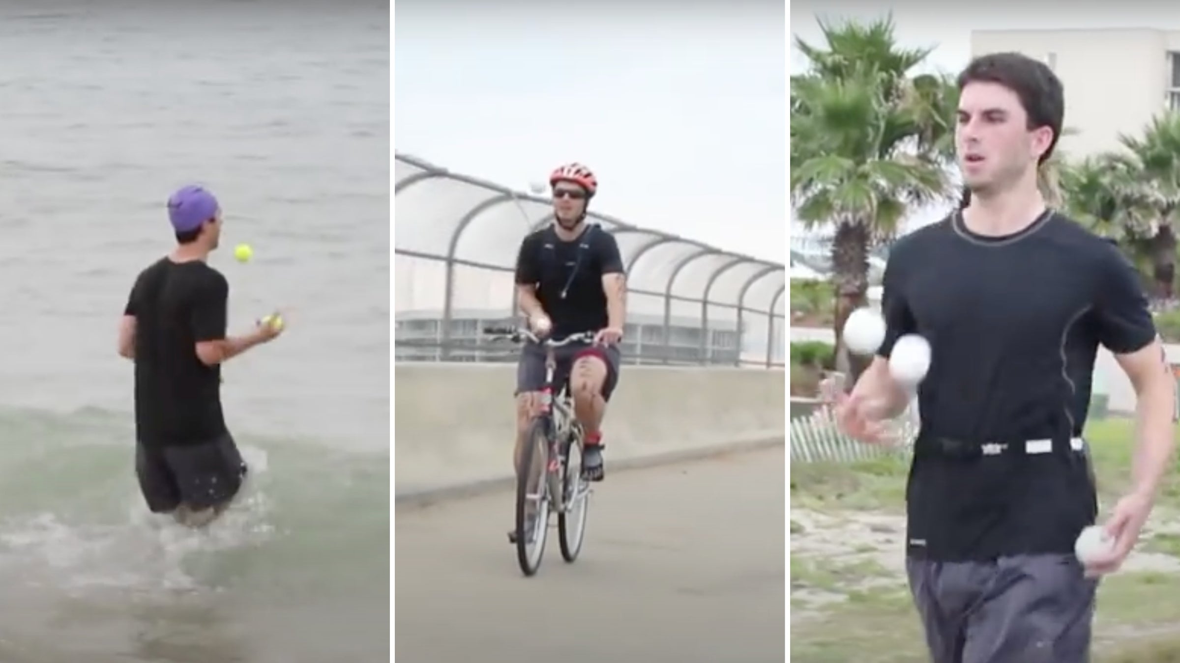 Salter took on the challenge and, on top of typical triathlon training, he had to figure out how to swim on his back while juggling three balls, then biking with one hand on the handlebars and the other tossing two balls. The swimming proved especially difficult, perhaps because no one had really ever done it before. Fellow joggler Perry Romanowski compared Salter’s ability to master “swuggling” to that of Roger Bannister breaking the four-minute mile: “He was the first one,” Now that he’s done it, other people will do it too,” he said. (And he was right: In 2016, an Israeli man, inspired by Salter, finished a 3.5 kilometer race in the Sea of Galilee while swuggling and later completed a triathlon.)