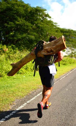 1. It must be special to that area. “In England you might get an oak tree, but Caribbean something more tropical,” he says. On the Caribbean island of Nevis, where he raced his treeathlon, news spread quickly that he needed a 100-pound tree. “We had people from all over the island looking for one for me,” he says. “We had so many trees to choose from in the end, but I just gravitated to this oddly shaped one—it just had character. It had been blown down in the hurricane just weeks before and I just felt it had some fight left in him and one last adventure.”