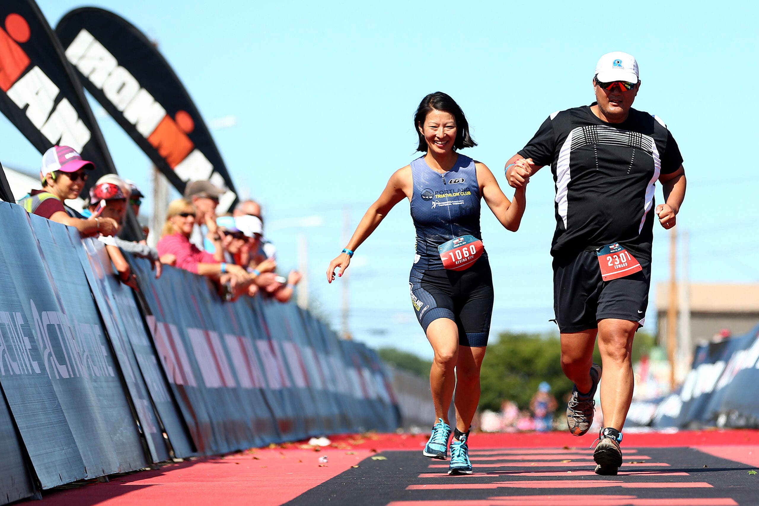 Age-group triathletes Regina Kim Yoon and Edward Yoon hold hands in the finisher’s chute at 2019 Ironman 70.3 Maine. (Photo: Maddie Geyer/Getty Images)Heather Jackson celebrates with husband Sean Watkins after winning Ironman Arizona 2018. (Photo: Christian Petersen/Getty Images)Two age-group triathletes kiss as they arrive to the finish line of Ironman Barcelona 2017. (Photo: Gonzalo Arroyo Moreno/Getty Images )