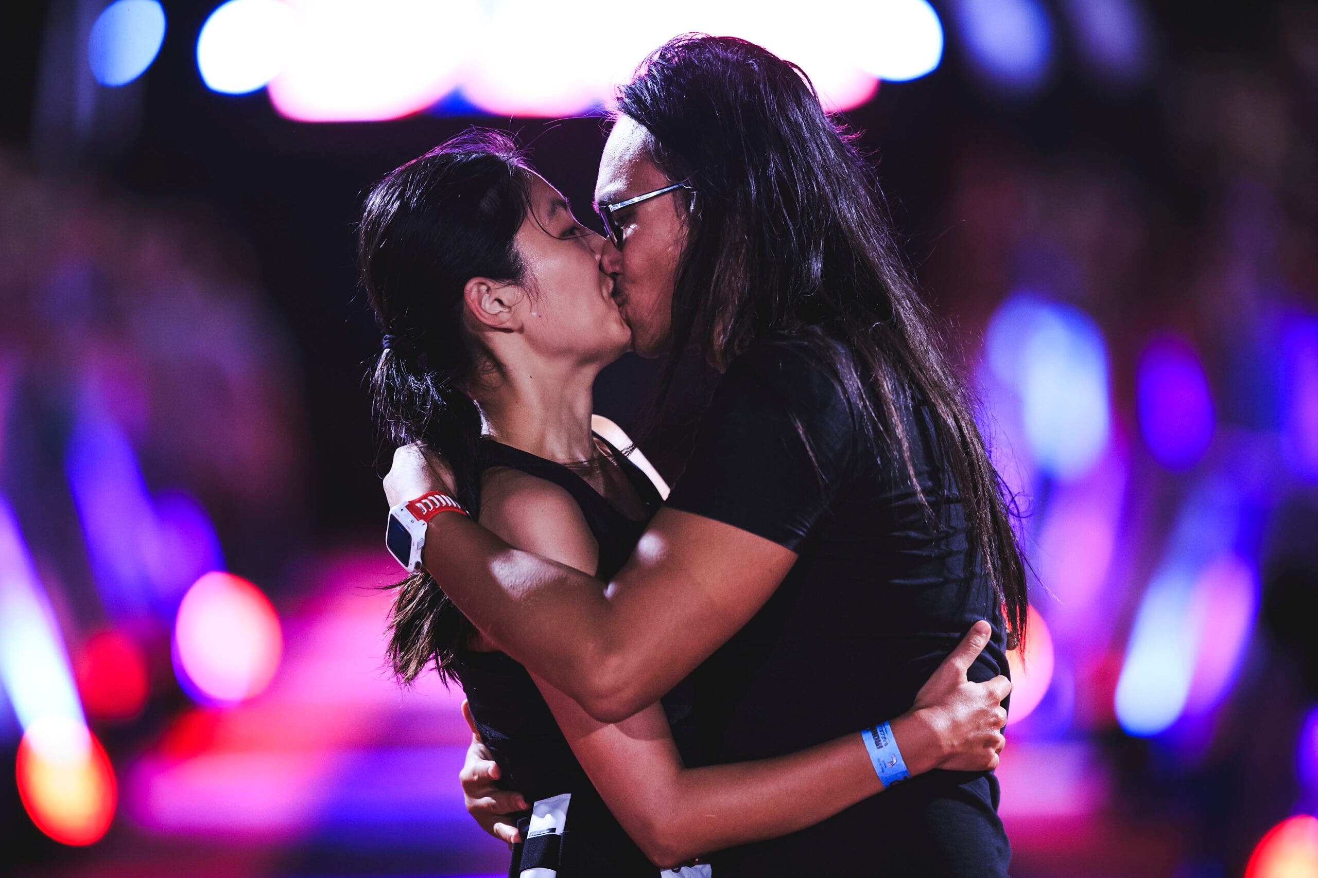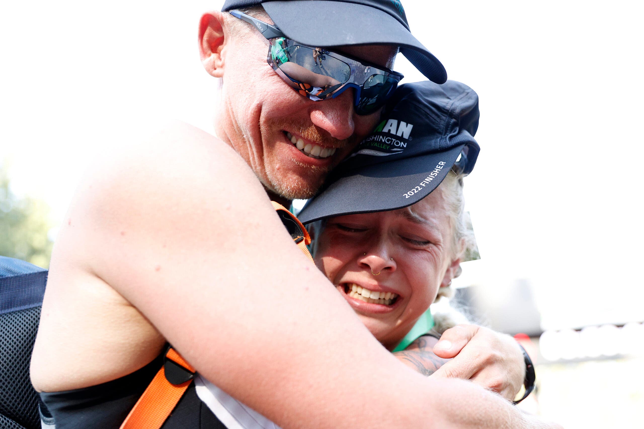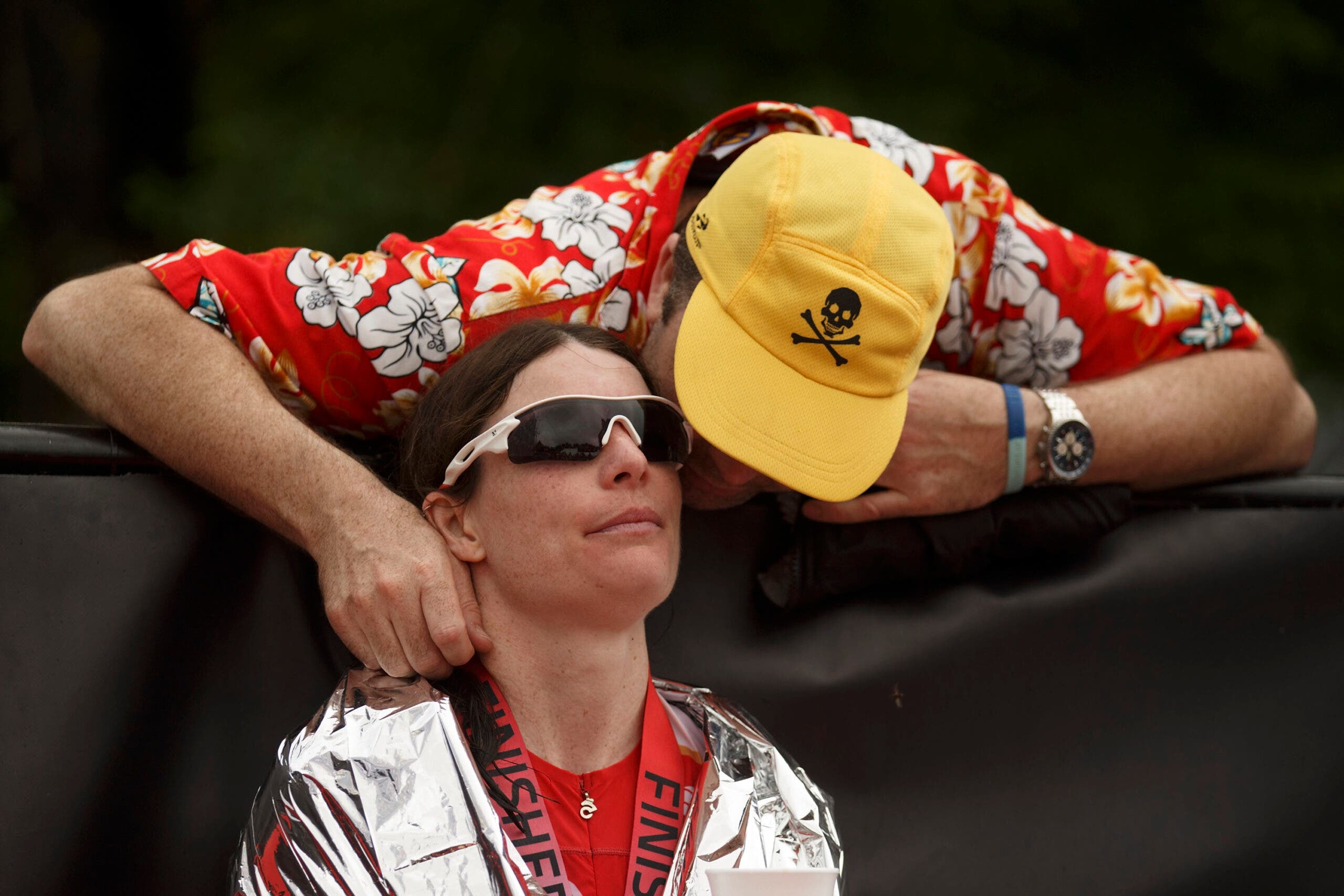An athlete embraces a supporter after finishing Ironman 70.3 Augusta 2022. (Photo: Kyle Rivas/Getty Images)Jeffrey Warwick of Bend, Ore. hugs Kamrace Clardy of Richland, Wa. after they finished Ironman 70.3 Washington 2022. (Photo: Steph Chambers/Getty Images)Pro triathlete Patrick Lange of Germany embraces his wife Julia after winning the Challenge Roth 2021. (Photo: Jan Hetfleisch/Getty Images)Athletes kiss after crossing the finish line at Ironman Kalmar 2018. (Photo: Getty Images)Emma Perkins kisses husband Sam Perkins, who has ALS, after Sam finished the Outlaw Half triathlon with his team. (Photo: Ryan Sosna-Bowd/ Getty Images)