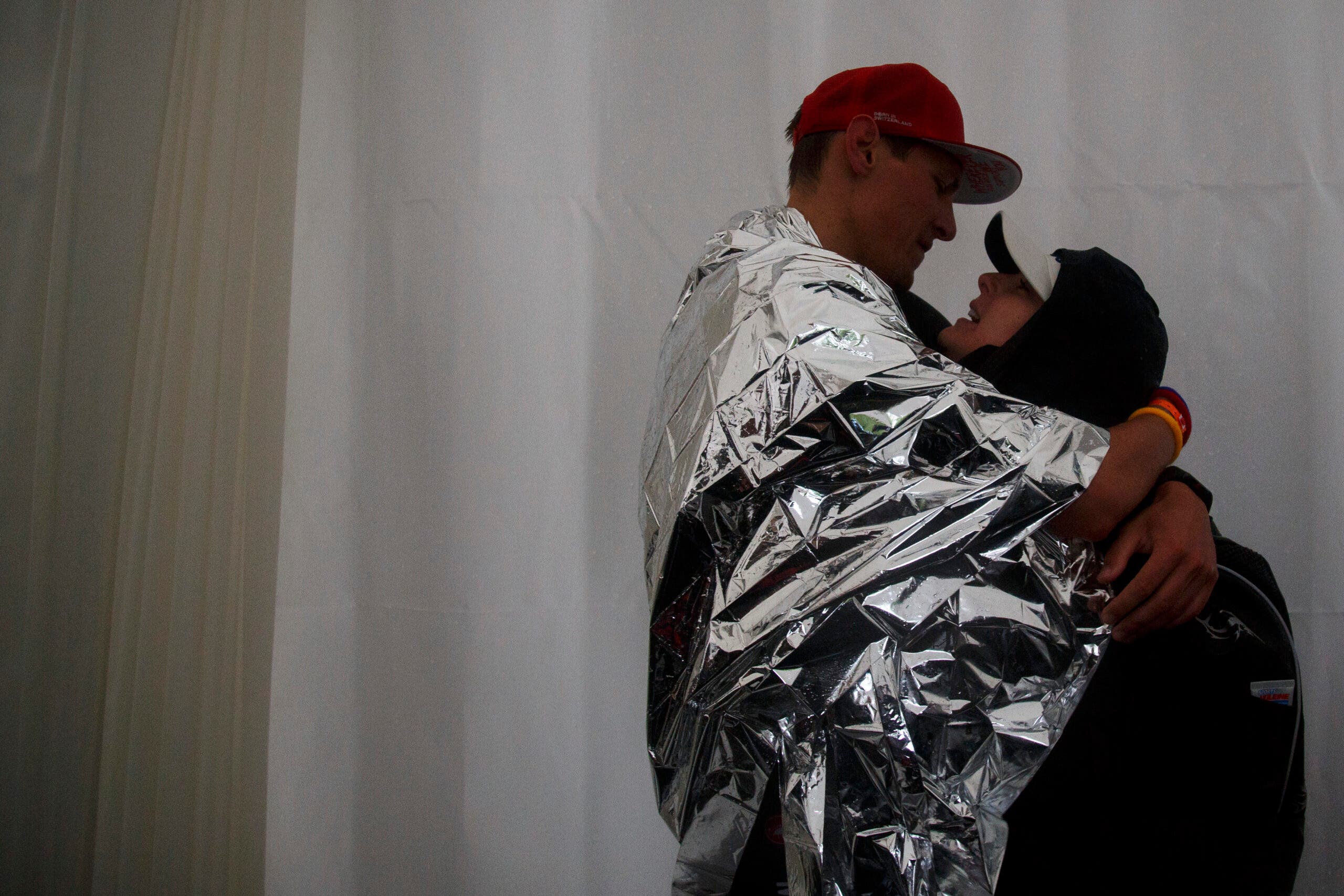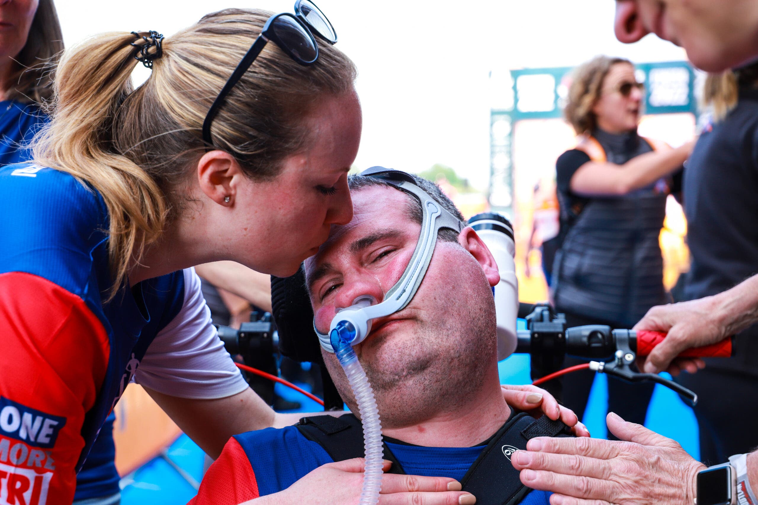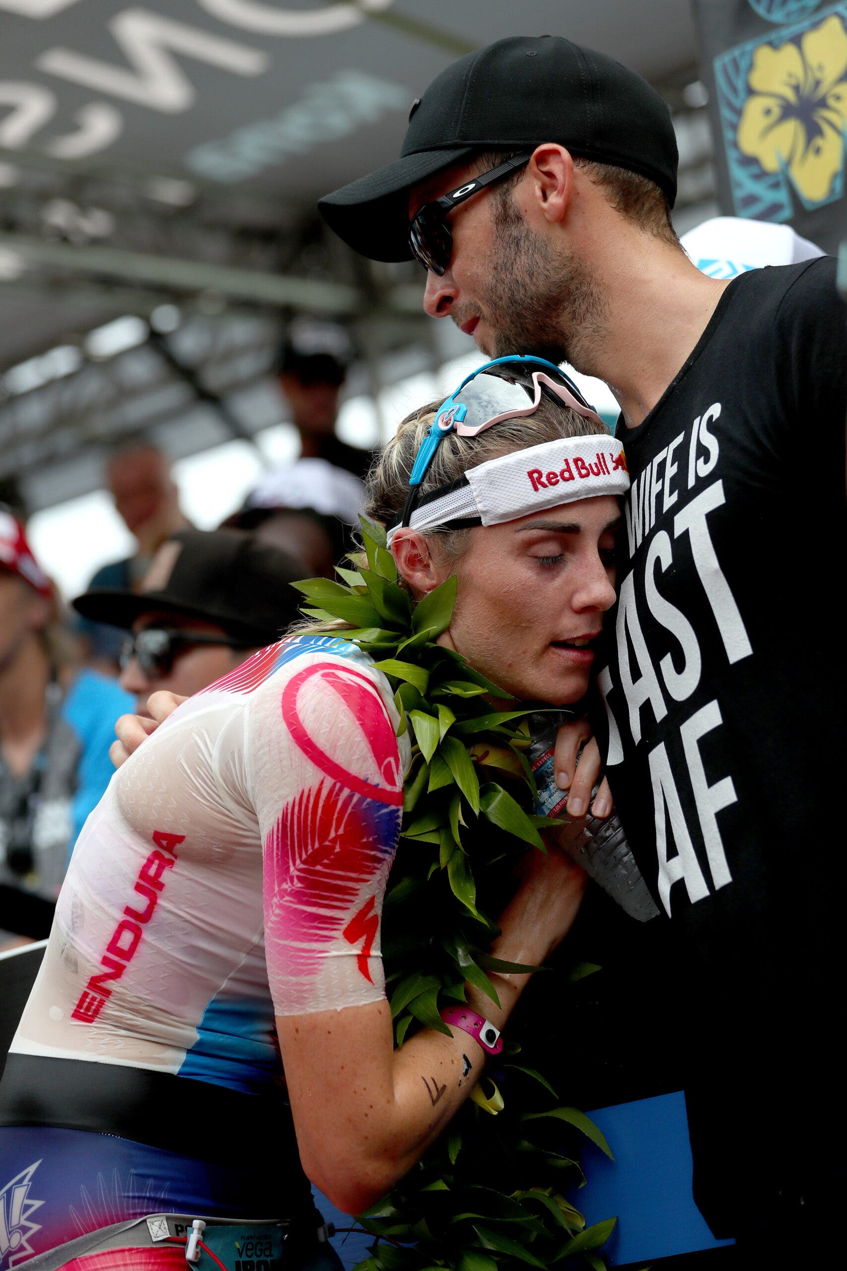 An athlete embraces a supporter after finishing Ironman 70.3 Augusta 2022. (Photo: Kyle Rivas/Getty Images)Jeffrey Warwick of Bend, Ore. hugs Kamrace Clardy of Richland, Wa. after they finished Ironman 70.3 Washington 2022. (Photo: Steph Chambers/Getty Images)Pro triathlete Patrick Lange of Germany embraces his wife Julia after winning the Challenge Roth 2021. (Photo: Jan Hetfleisch/Getty Images)Athletes kiss after crossing the finish line at Ironman Kalmar 2018. (Photo: Getty Images)Emma Perkins kisses husband Sam Perkins, who has ALS, after Sam finished the Outlaw Half triathlon with his team. (Photo: Ryan Sosna-Bowd/ Getty Images)