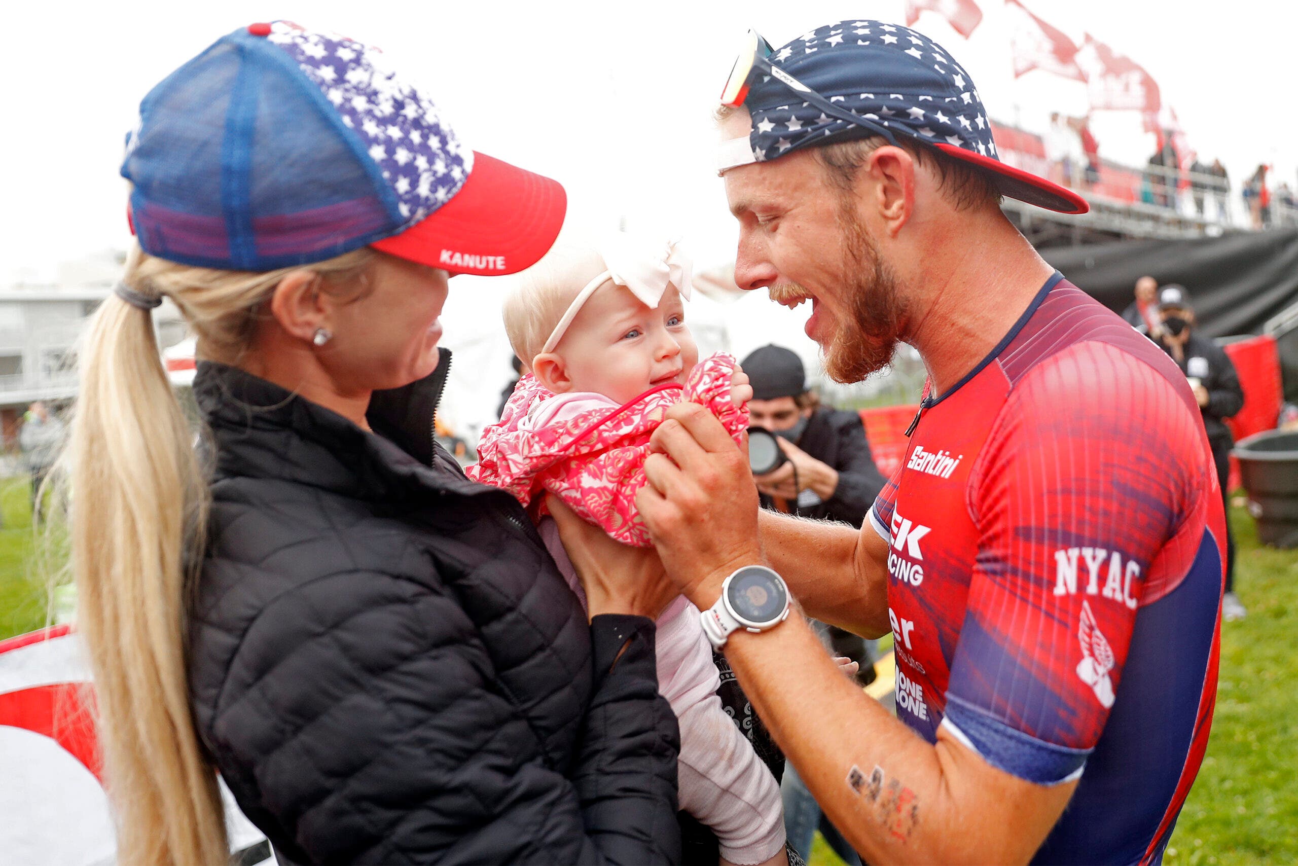 Lucy Charles-Barclay celebrates with husband Reece Barclay after finishing second at the Ironman World Championships 2019. (Photo: Tom Pennington/Getty Images)Ben Kanute celebrates his fourth-straight Escape from Alcatraz win with his wife, Courtney, and their daughter, Briella. (Photo: Scott Strazzante/Getty Images)Elaine Garvican from Great Britain receives kisses at the finish line during Ironman 70.3 UK Exmoor 2017. (Photo: Gonzalo Arroyo Moreno/Getty Images)