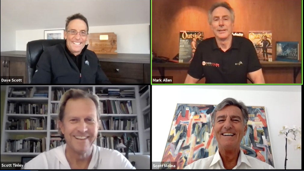It may have been a Zoom presentation instead of an in-person gathering on a race course, a stage, or over beers at a bar, but the sport of triathlon’s legendary “Big Four”—Mark Allen, Scott Molina, Dave Scott, and Scott Tinley—got together for the first time in about a decade last Thursday. The foursome, who famously raced each other tooth and nail throughout the 1980s and 90s and, subsequently, launched the sport into what it is today, gave a group keynote speech in the form of an un-moderated panel during USA Triathlon’s Endurance Exchange Expo. And it was awesome.