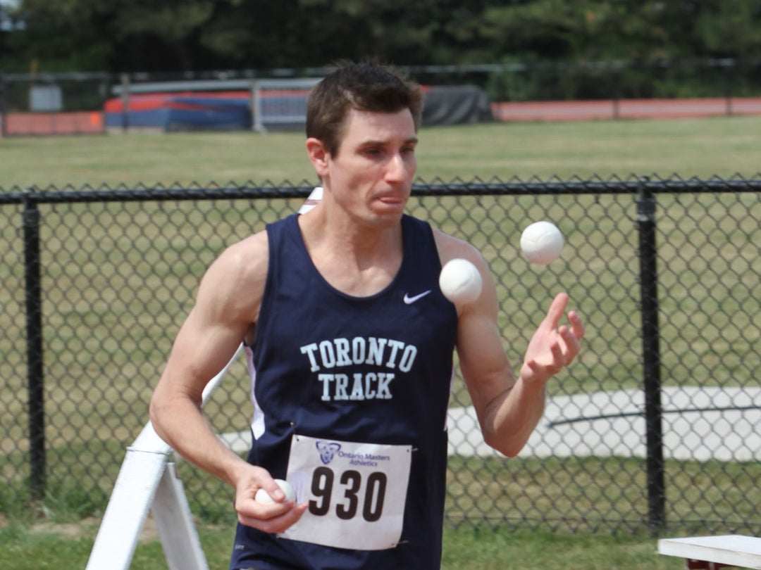 Hilarious? Yes. Doable? Maybe. He was competing for his local track team, and he had just learned to juggle. “So I went to the park to see how it worked. I found out quickly that the arm swing of running matches the toss pattern.” He was a natural.