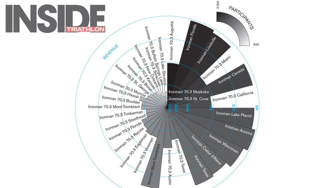 Even with plenty of series vying to challenge Ironman and lower-priced events, the champion stands alone. With nine sold-out iron-distance races and a whopping 24 Ironman 70.3 sellouts last year in North America alone, most of the sport’s registration dollars are still funneling toward World Triathlon Corporation, the owner of Ironman. The width and shade of each pie piece represents the number of registrants in the race, and the length depicts the estimated total money spent on entry fees.