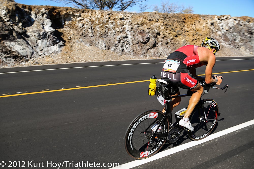 The pro women took off two minutes after the pro men, and two women—former collegiate swimmer Haley Chura of the U.S. and former ITU racer Liz Blatchford of Great Britain—soon pulled away from the pack. Chura exited the swim first in a time of 49:22, and Blatchford was about 30 seconds back. Third out of the water was Ellis, who was only two minutes back by the time she exited T1 (there’s a quarter-mile run from the swim exit to transition)—but looked like she was shivering from the swim. German Anja Beranek was fourth, less than four minutes back, and Australia’s Rebekah Keat was fifth about 5:30 back to start the bike.