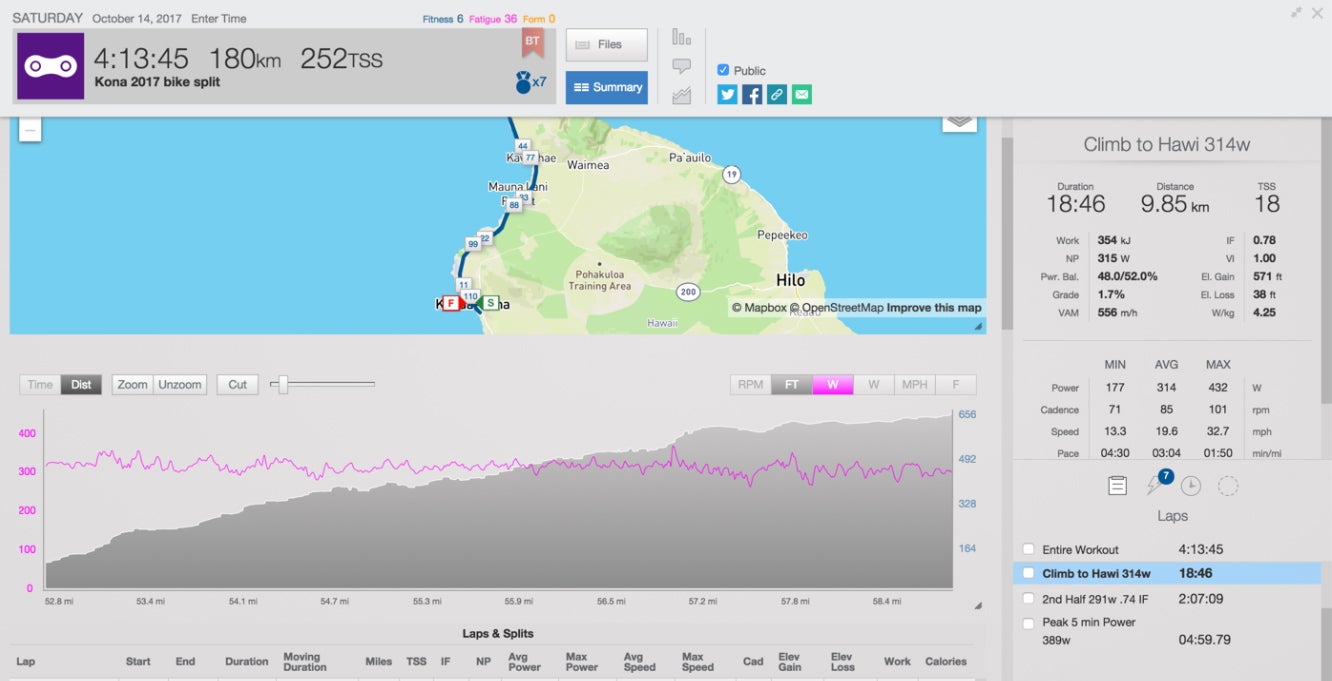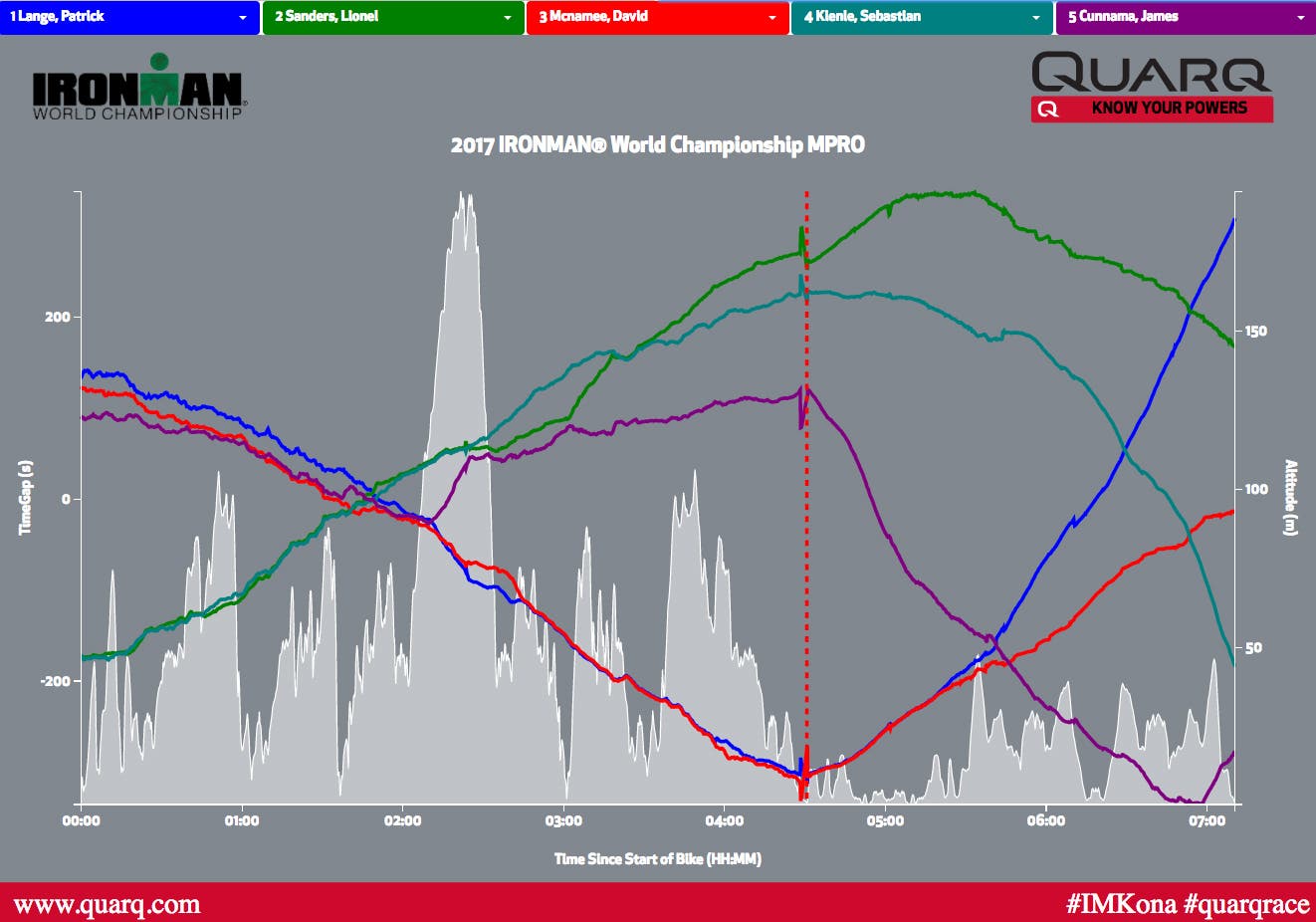 While that is a large gap, Sanders was able to stay with two major allies in Kienle and former professional cyclist Cameron Wurf. In the Quarq tool, if you change McNamee to Wurf you can see how the three quickly bridge the initial time gap before the climb to Hawi.