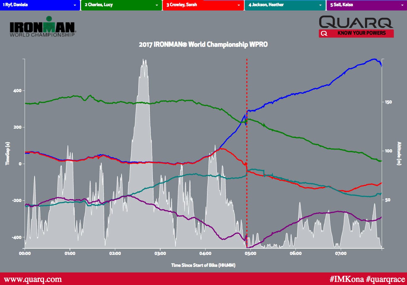 As Ryf continued to push the pace Charles was starting to fall off. Brandon, who was keeping pace with Charles, suffered a mechanical (which can be seen as the sharp cliff drop on her data line). By the end of the bike Ryf had made up the five-plus-minute deficit and taken the overall lead heading into T1 over the course of just 25 miles.