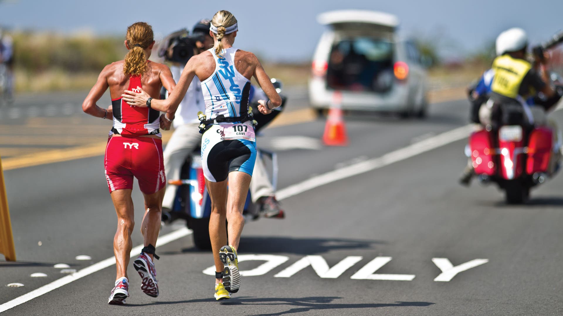 Once on the marathon, she continued her steady pace—fueled by the positivity that she could overcome anything. Wellington took the lead as she entered the Energy Lab, well aware that a fast-running Carfrae was somewhere behind her. Toward the final miles of the run on her way back onto the Queen K, the severity of her injuries started to catch up with her. “Everything hurt so badly,” she said. “But you can’t let your head drop for a second. Not a single second. I kept recalling the words of Rudyard Kipling: ‘Keep your head, keep your head. Fill the unforgiving minute with 60 seconds of distance run.’”
