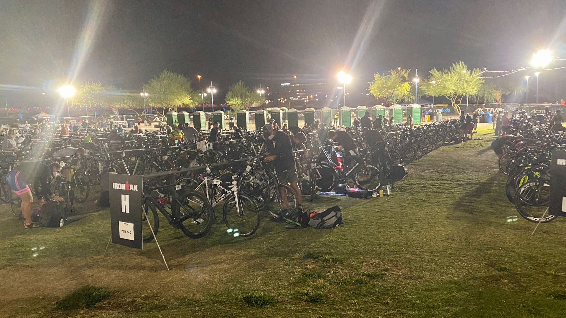 The morning was closer to business as usual than packet pick-up. Athletes were required to wear masks within transition. A couple of small differences that athletes had to plan for: no body marking and no morning clothes bags. Mechanics were still on hand to help with the usual last-minute adjustments, like dealing with the over-inflated tires that had popped in the Arizona sun the previous day. Port-a-potties were placed at least six feet apart within transition with orange tape marking six feet for people waiting in line.