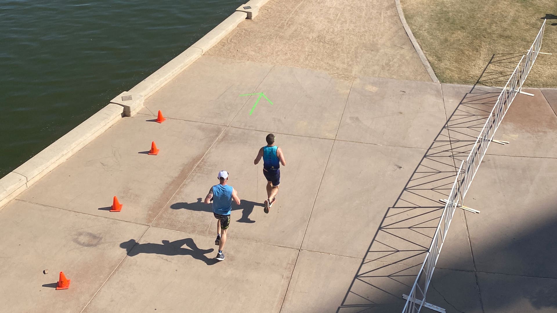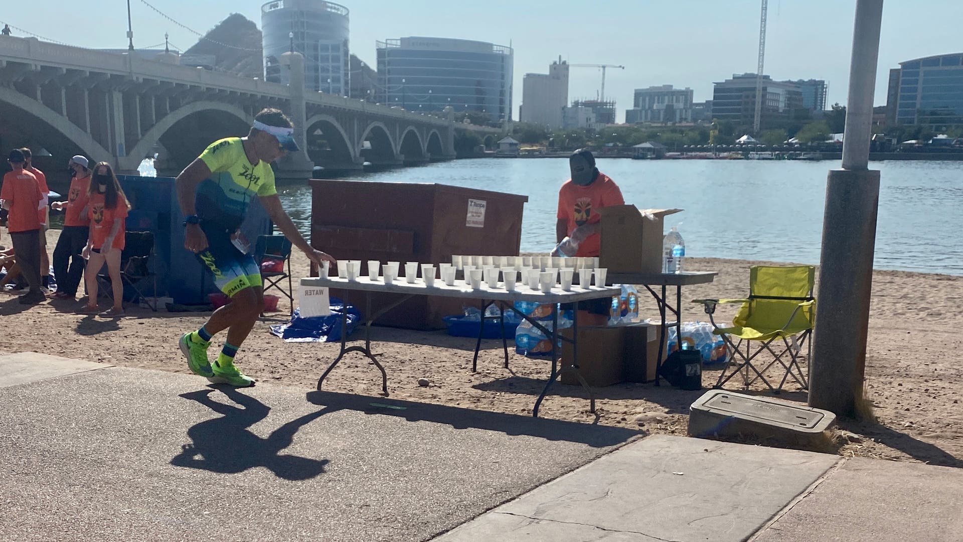 At some point during the morning, barricades were relocated to frame the finish line area. To enter the general Tempe Beach Park area, spectators were required to wear masks.