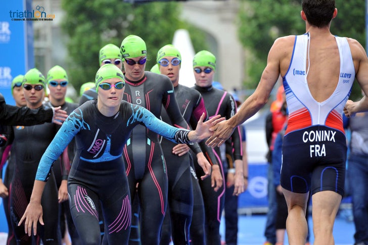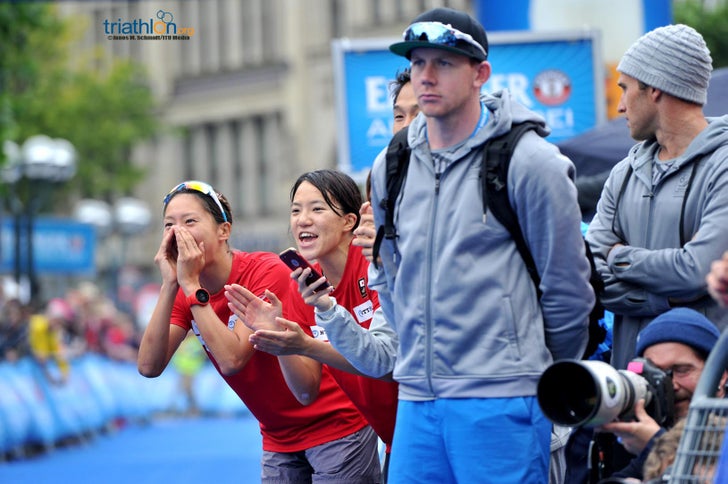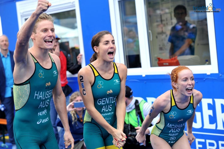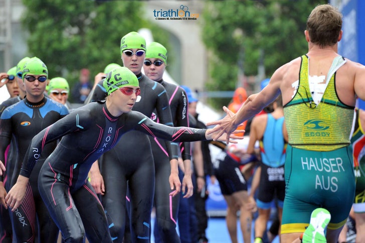 (Quick reminder: In mixed relays, teams of two men and two women completing each a short-course triathlon (300m swim, 8km bike, 2km run) before tagging off to their teammate to take over.)