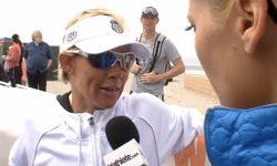 TriCenter’s Ann Wessling talks to Ironman 70.3 California winner Mirinda Carfrae moments after she crosses the finish line.