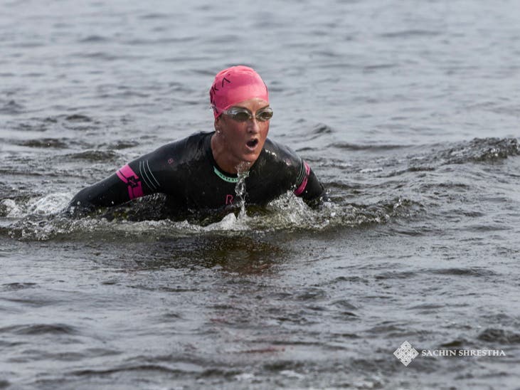 MBK: Keeping my composure. This was the theme of the race. Like many people experience in the lead-in and on the day of the race, it certainly had its fair share of adversity. Half the battle for us all is getting to the start line happy, healthy, injury-free and with our chi intact. While I was thankful to be 90 percent of those things, two days before the race, I badly bruised my foot doing a flip turn of all things (how many flip turns have I done in my life?!) and was limping around leading into the race. After some serious icing and ibuprofen, it was tolerable enough to race. The body can be so resilient if we allow it to be! Then, 15 minutes before the start of the race, my husband was zipping up my very trusty wetsuit and it ripped down the entire backside. This just doesn’t happen! I sprinted up to the expo and thankfully was able to rent a wetsuit very quickly for $50. Between the foot situation, the pre-swim stuff and the bike bolt drama – I mean, it’s a crack up, right? I believe the key, though, with bad luck or any adversity thrown our way is to keep composure.