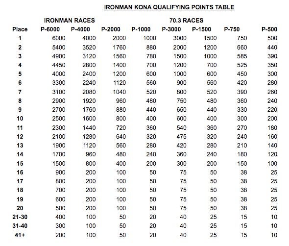Effective September 1, 2010, the single-performance slot based system for pro athletes will be discontinued. Beginning with Races after August 31, 2010, pro athletes will earn points for Kona Qualifying correlating to their finish position. The top 50 male and top 30 female pros* in the KPR at the end of each Qualifying Year will qualify to race in Kona.