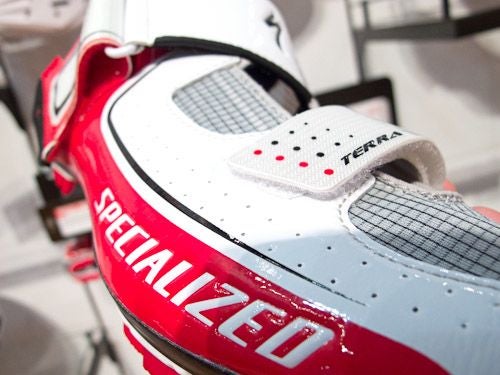 A few pros have special pairs of XTERRA-specific tri shoes that combine a tri upper with a mountain-friendly sole and Specialized is now offering that combo to regular riders as well. The Trivent Terra’s upper has the same mid-volume fit, single-strap closure system, massive vents and transition friendly features found on the standard Trivent road triathlon shoe, but the sole has rubber grippers attached at the toe, heel and midfoot. These grippers are more minimalistic than most mountain bike shoes, but still protect the key areas of the sole and should provide grip should the rider have to come off the bike and walk.