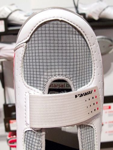 Scott’s triathlon shoes are taking a major step up in quality in 2012. The Tri Carbon has Scott’s stiffest carbon sole that, like some other shoes, uses raised ridges for robust stiffness. It has a large heel loop to grab during a flying mount and a tiny rubber band loop on the side of the shoe to suspend the shoe close to horizontal for a mount. Its large upper Velcro strap folds to the outside of the shoe. The upper has large mesh sections and ample ventilation. Although the mesh material is perforated, it is still quite stiff and doesn’t seem to stretch at all, which should help lock the foot against the sole. The Tri Carbon is already available. $200.
